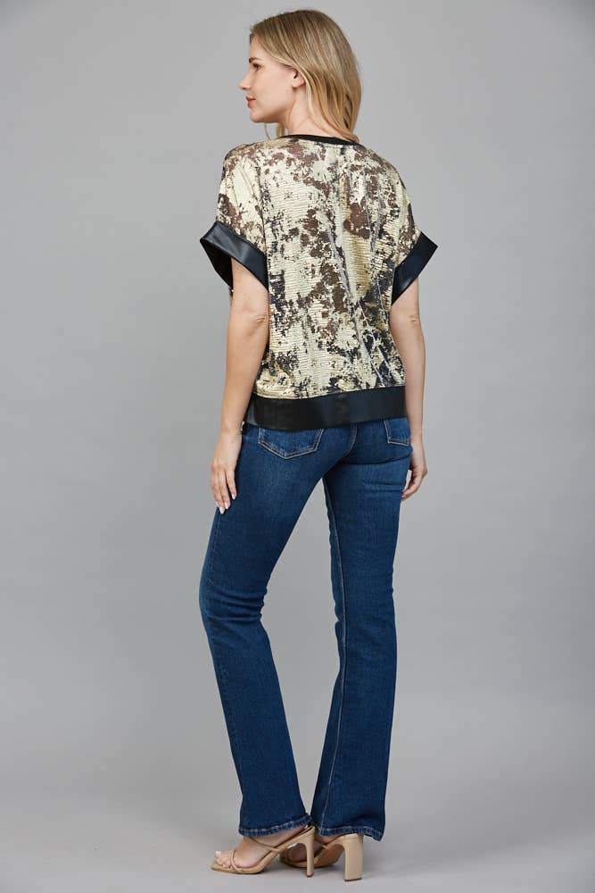 Elevate your wardrobe with this contemporary drop-shoulder top, featuring an eye-catching abstract metallic pattern that captures light beautifully. The relaxed wide sleeves offer modern silhouette appeal, while the premium fabric blend—100% polyester shell with 95% polyester/5% spandex construction—delivers comfort and subtle stretch. Versatile and polished, this piece transitions seamlessly from casual to elevated styling. Available in sophisticated colorways including gold/black and rose gold.