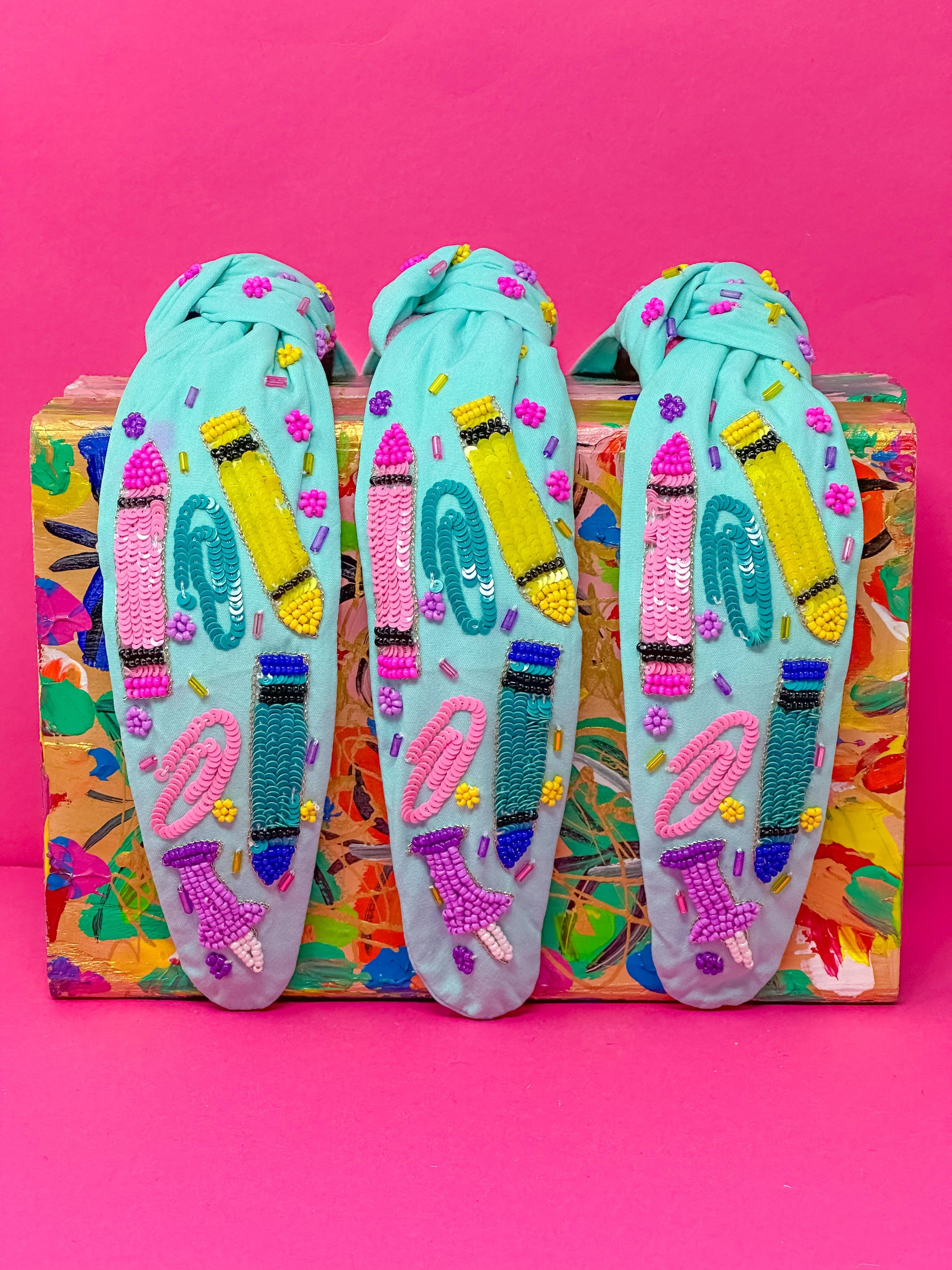 The Christi Headband features a knotted design adorned with sequin details, including a paperclip and pencil motif, making it an ideal gift for a distinguished teacher.