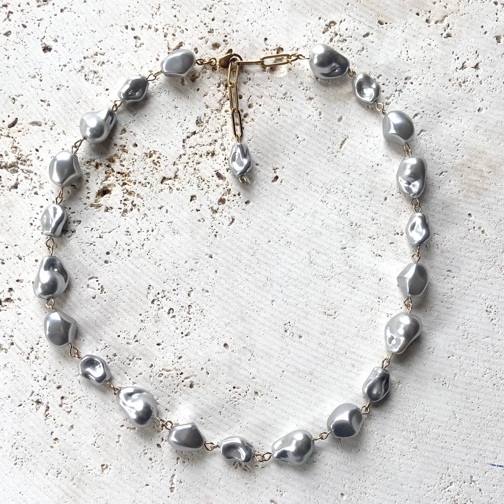 Embrace timeless elegance with our Baroque Pearl Strand Necklace, available in shimmering silver gray or classic white. Each necklace features hand-selected porcelain baroque pearls, celebrated for their organic shapes and lustrous finish, strung on delicate gold or silver-tone links for a refined, modern look.