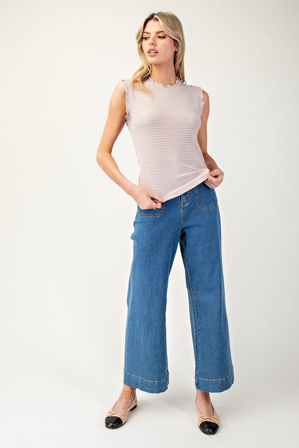 Striped sleeveless tank top featuring a ruffled round neckline, ruffle detailing on the armhole, a slight rounded bottom hem and is a fitted but stretchy fabrication. Model is 5'8" and wearing a small.