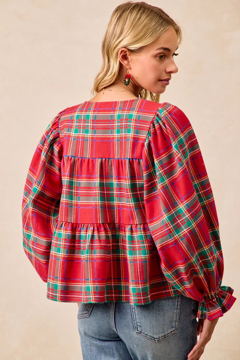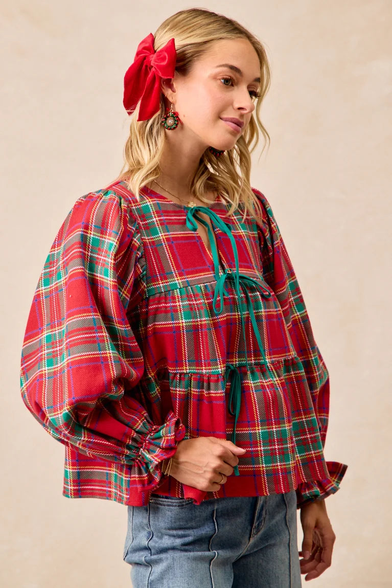 Add festive flair to your wardrobe with the Elle Top, featuring a classic Christmas plaid pattern and elegant front bow tie details. Crafted for a polished yet comfortable fit, this top effortlessly combines seasonal cheer with refined style, making it perfect for holiday gatherings and everyday wear alike.