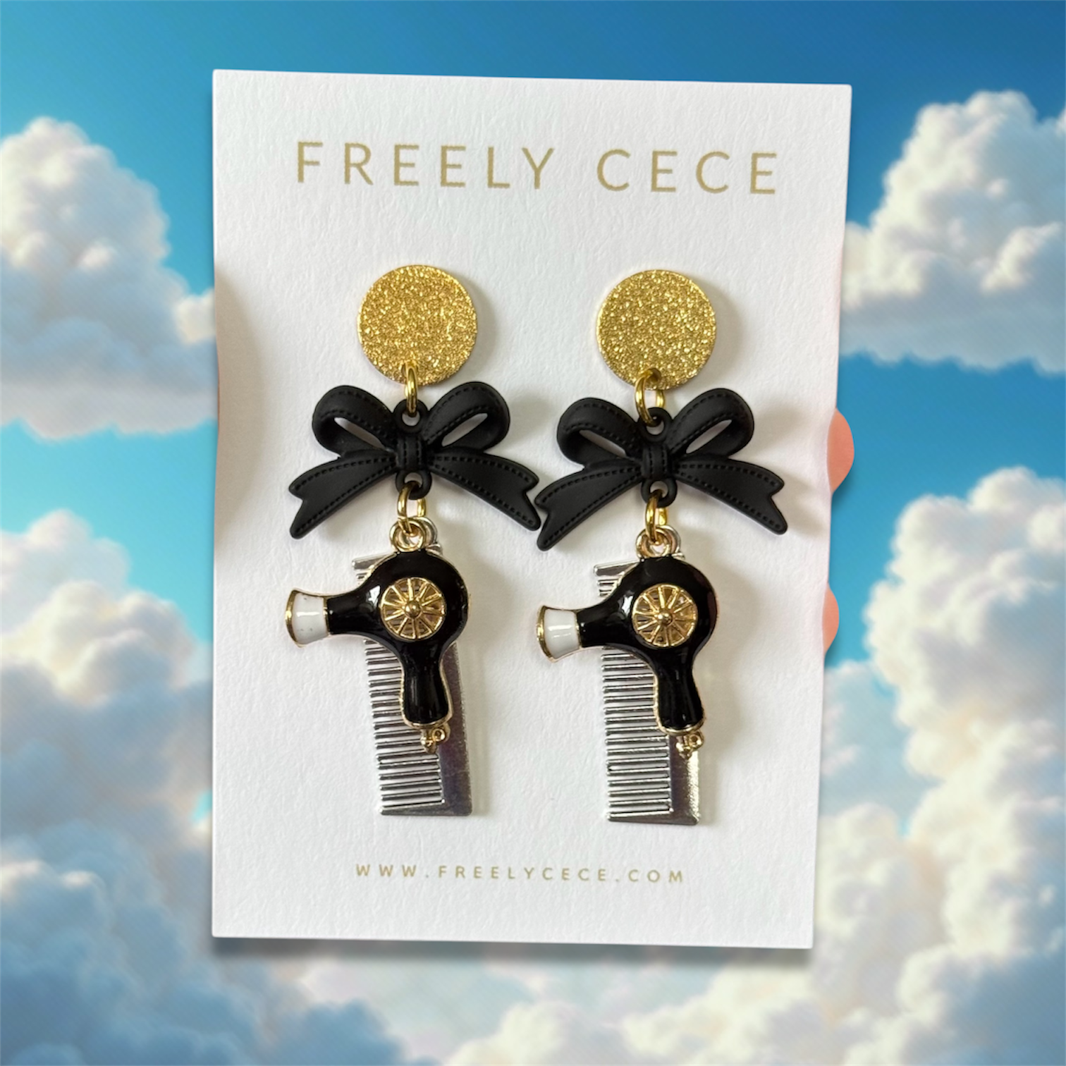 These earrings are perfect for the hair stylist, hairdresser, beautician, or cosmetologist in your life! A super cute hair dryer and comb dangle from a bow connector to create these trendy style earrings.