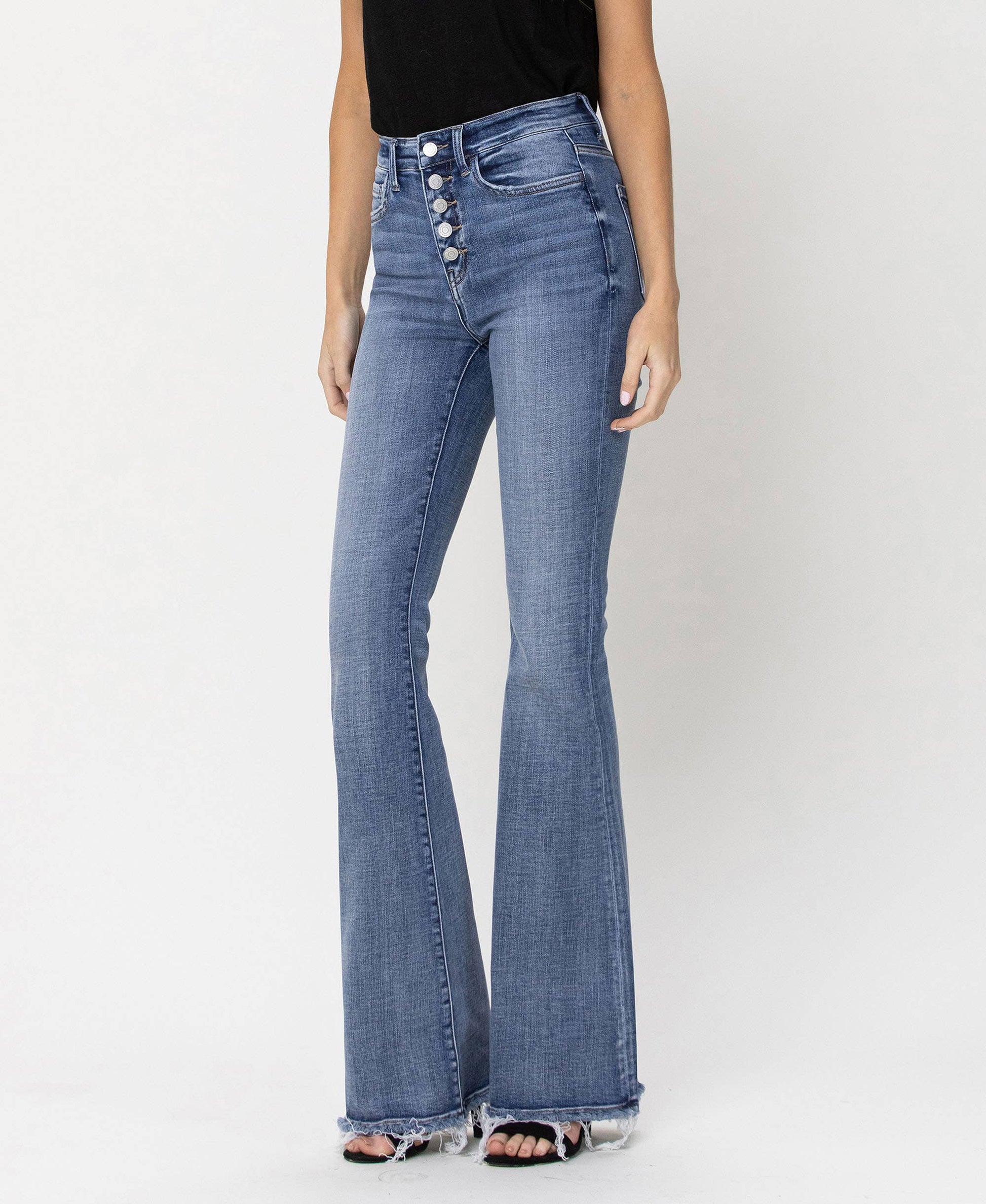COMFORT STRETCH DENIM, HIGH RISE WAIST, BUTTON UP FLY, FRAYED HEM, FULL LENGTH, FLARE JEANS