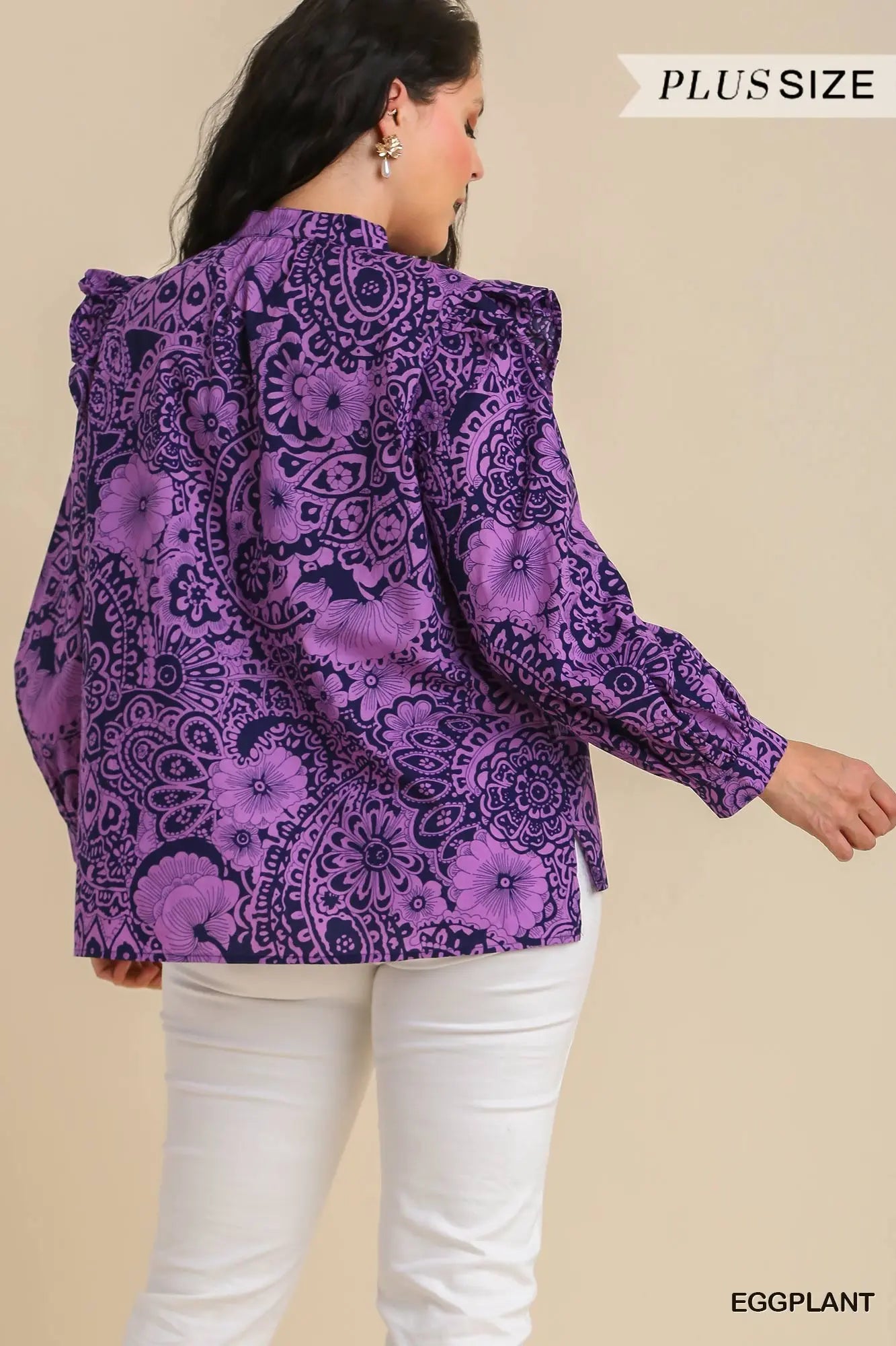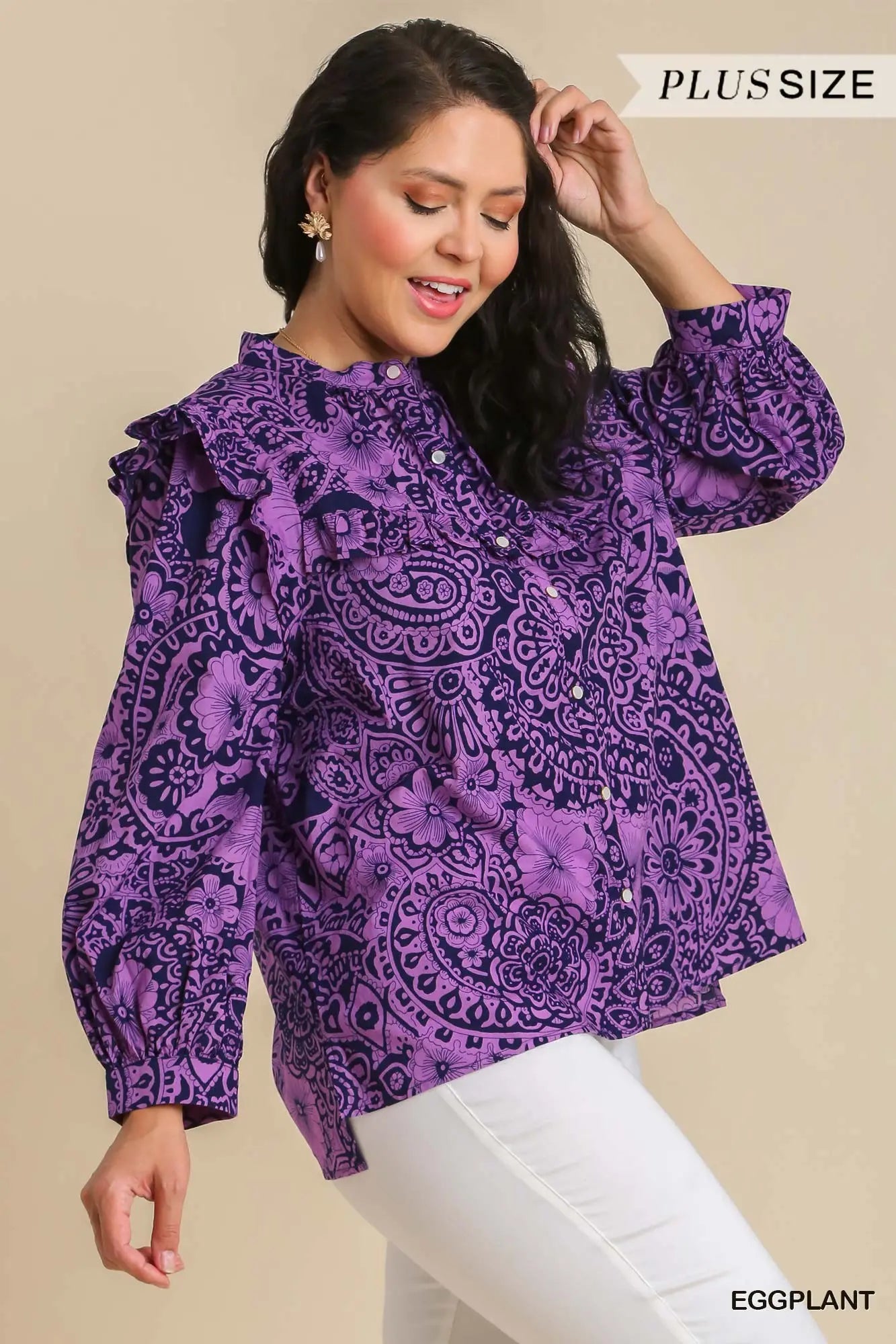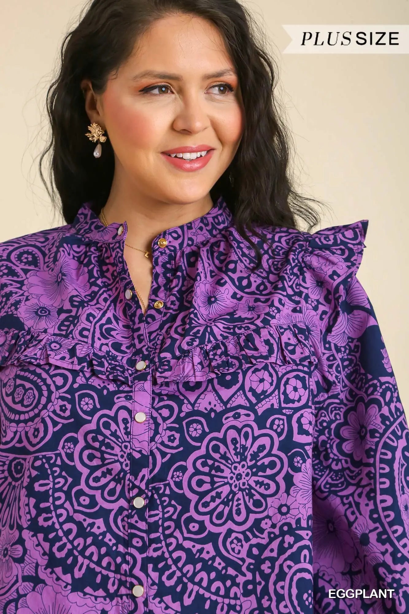Two Tone Button Down Top with Flutter Sleeve and Pearl Snap Buttons