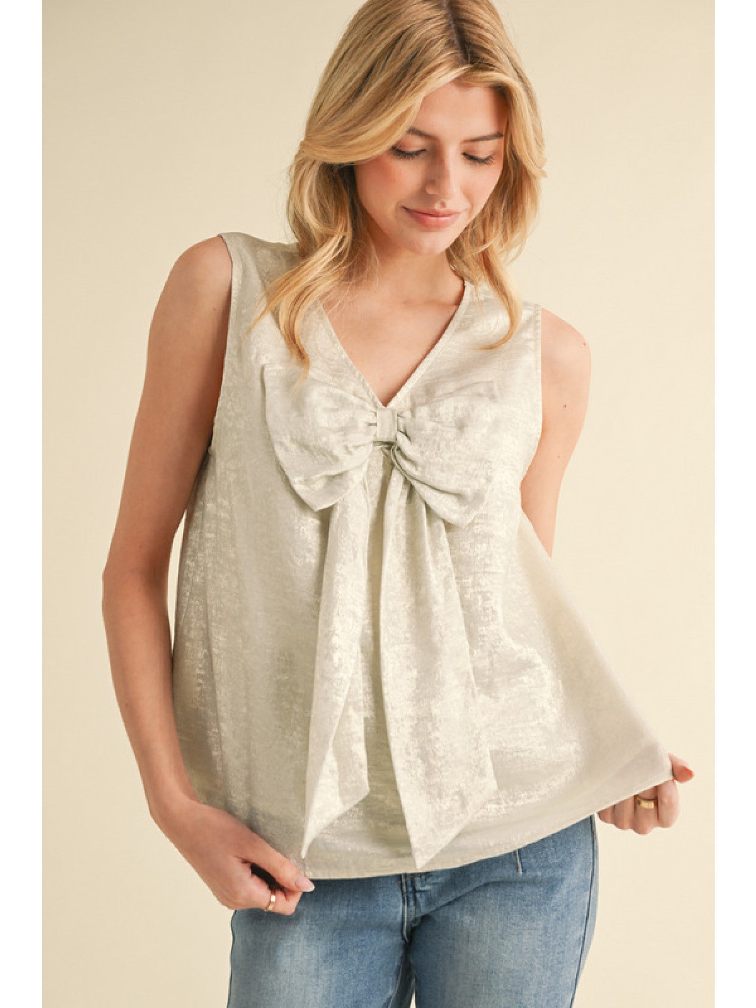 Metallic print top with V-neck, sleeveless and front big bow tie detail.