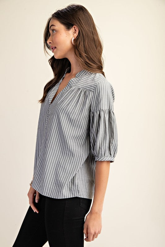 Striped Blouse with Quarter Length Bubble Sleeves Model is 5'10" wearing a small.