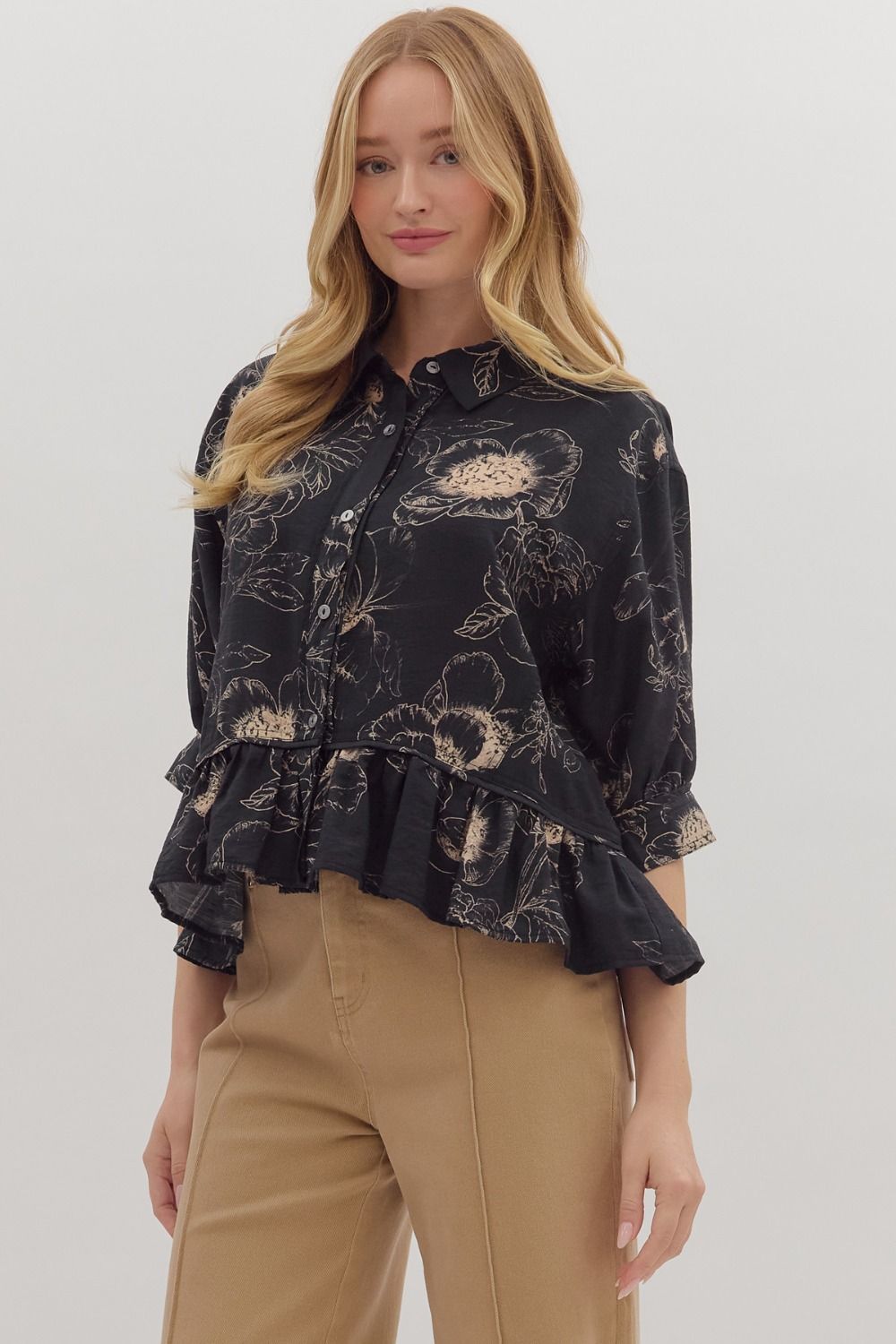 Floral print roll tab 3/4 sleeve high-low top featuring ruffle hem and button closure at front. Button closure at cuff. Unlined. Woven. Non-sheer. Lightweight.