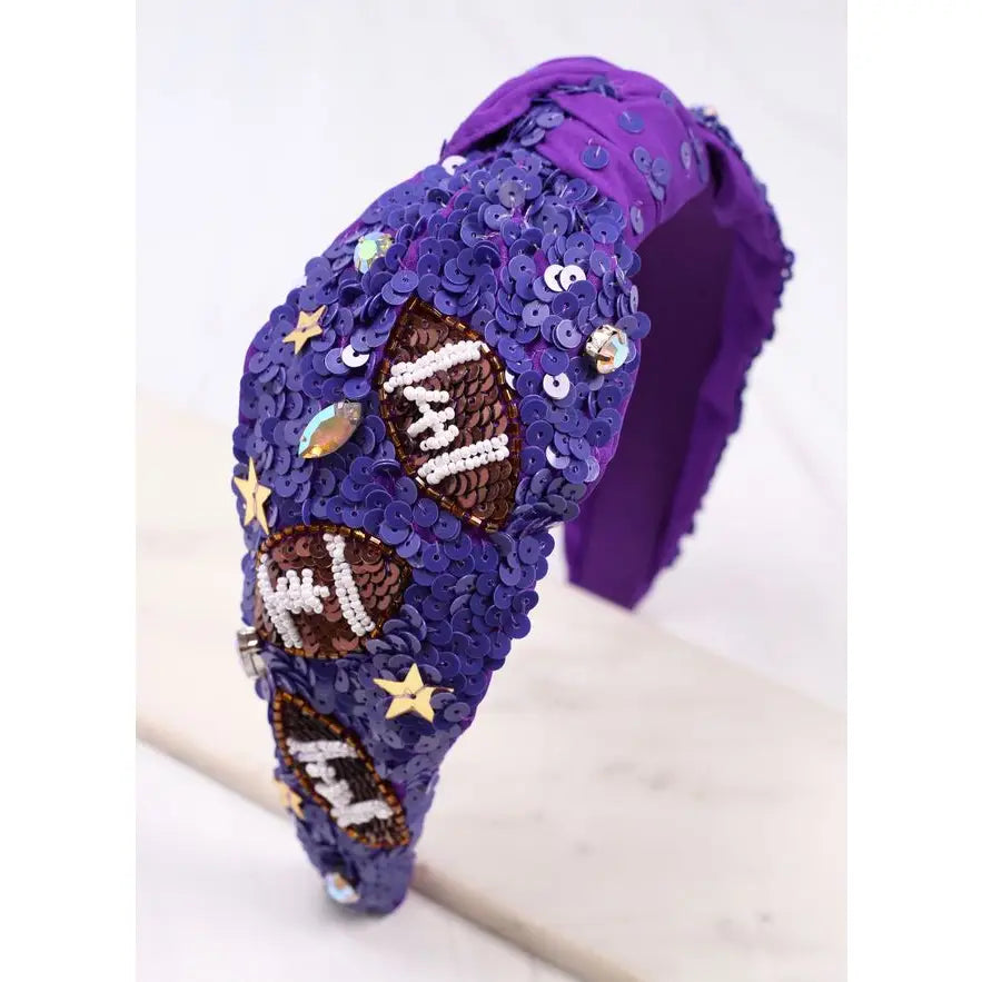 Elevate your game day look with the Shelby Headband, featuring football-inspired sequins that add a spirited touch to your outfit. Designed for comfort and style, this headband keeps hair securely in place while showcasing your team pride. Perfect for fans seeking a subtle yet festive accessory to complete their game day ensemble.