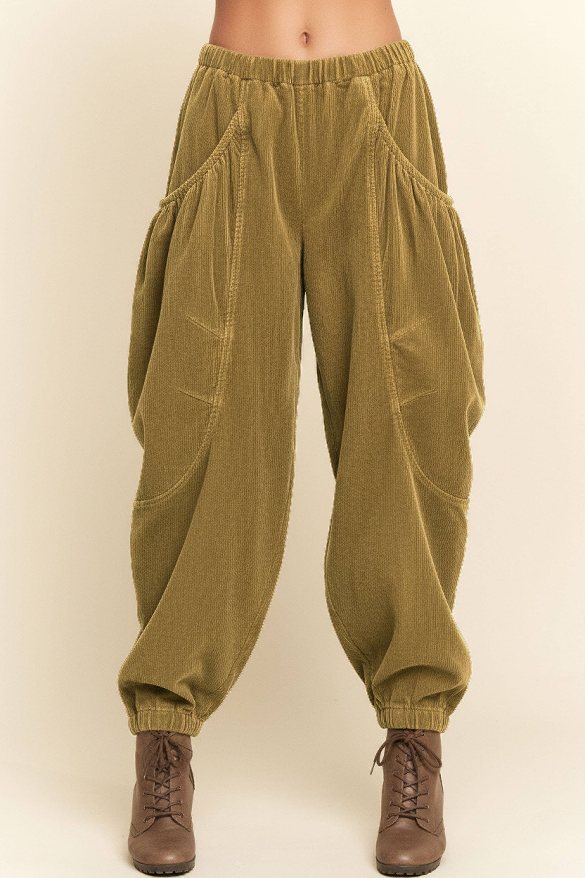 Elevate casual dressing with these relaxed corduroy barrel pants, designed with gathered oversized pockets, elastic waistband, and tapered cuffs. A versatile piece that blends comfort with artisanal detail, making them perfect for boutique buyers seeking wearable style with unique character.