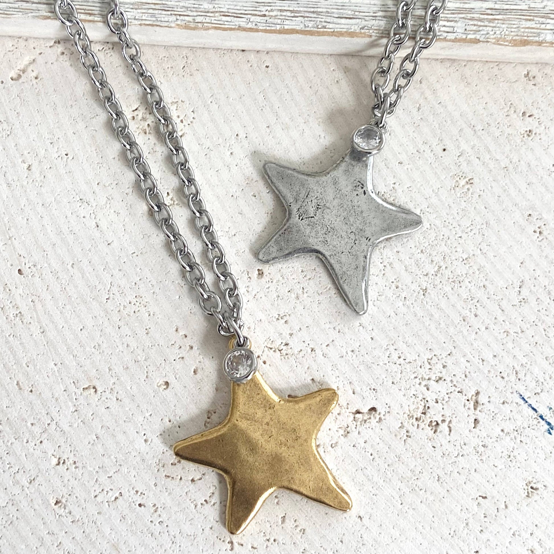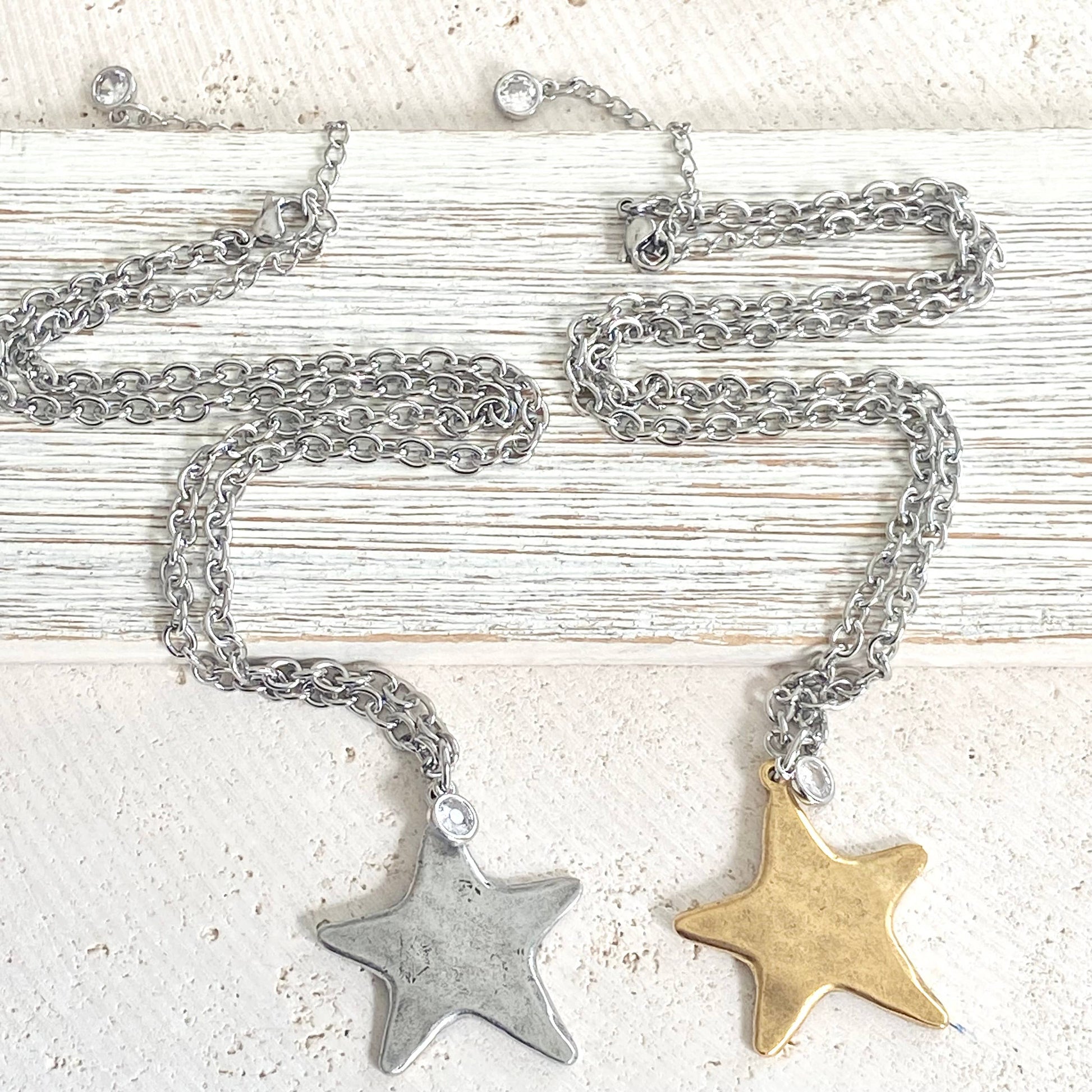 These star necklaces are fun to wear and edgy Glam. They are hand casted, and approximately 32”there is a cute dangling clear 6mm crystal charm. The chain is adjustable up to 17-20 inches. It is a non-tarnishing stainless steel. Choose your color