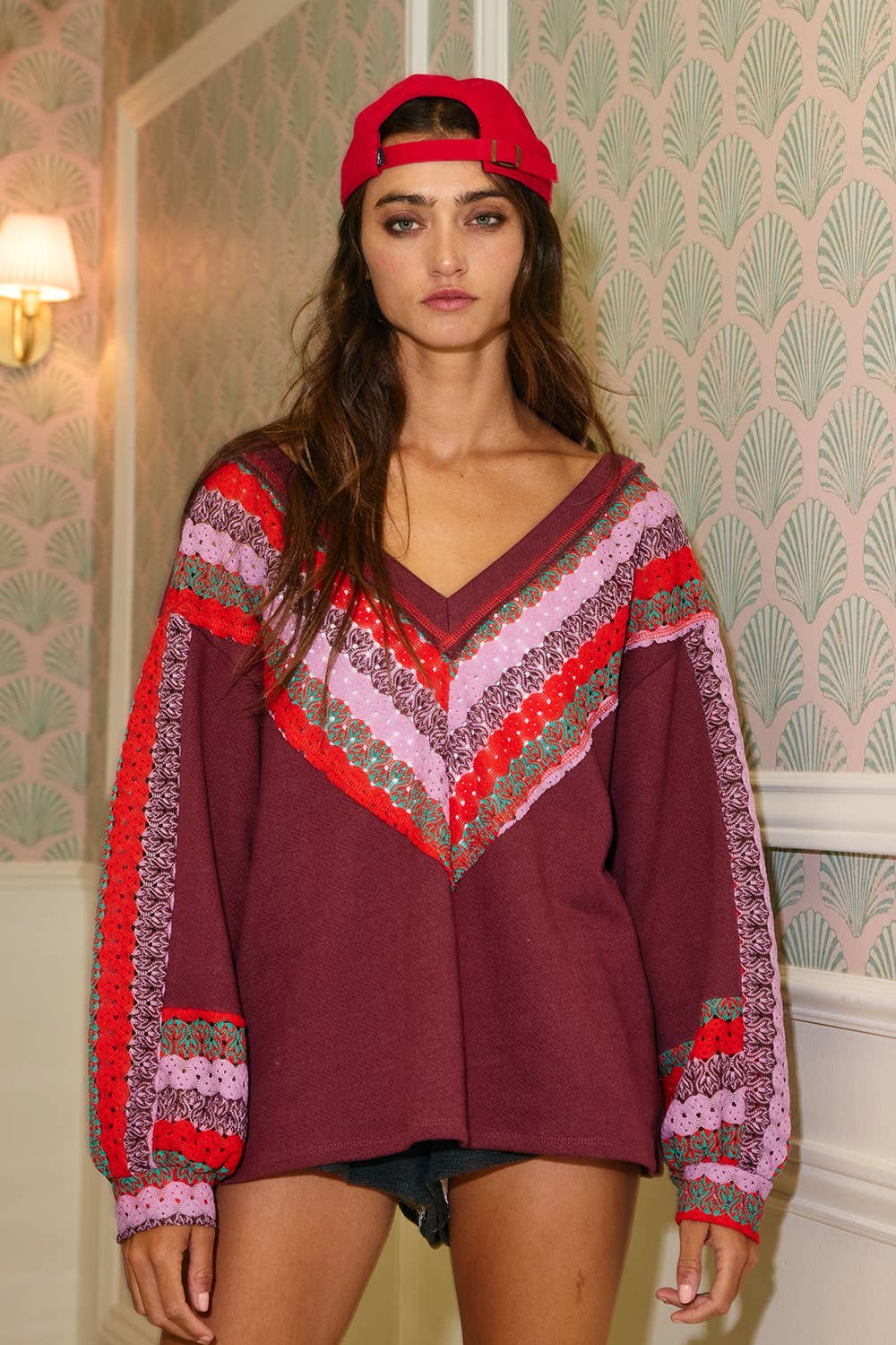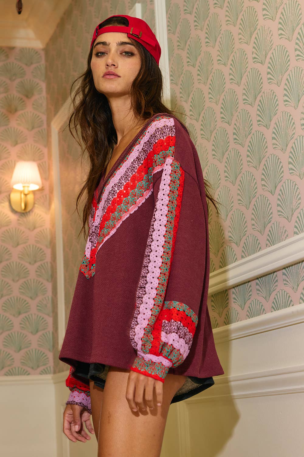 This sophisticated terry top features a flattering V-neckline and dropped-shoulder silhouette for effortless elegance. Long sleeves showcase delicate crochet lace accents at the neckline and cuffs, adding refined texture and visual interest. Reverse stitching and raw edge detailing contribute to its contemporary aesthetic, while the premium terry fabric provides comfort and structure. A versatile piece that seamlessly transitions from casual to polished occasions.
