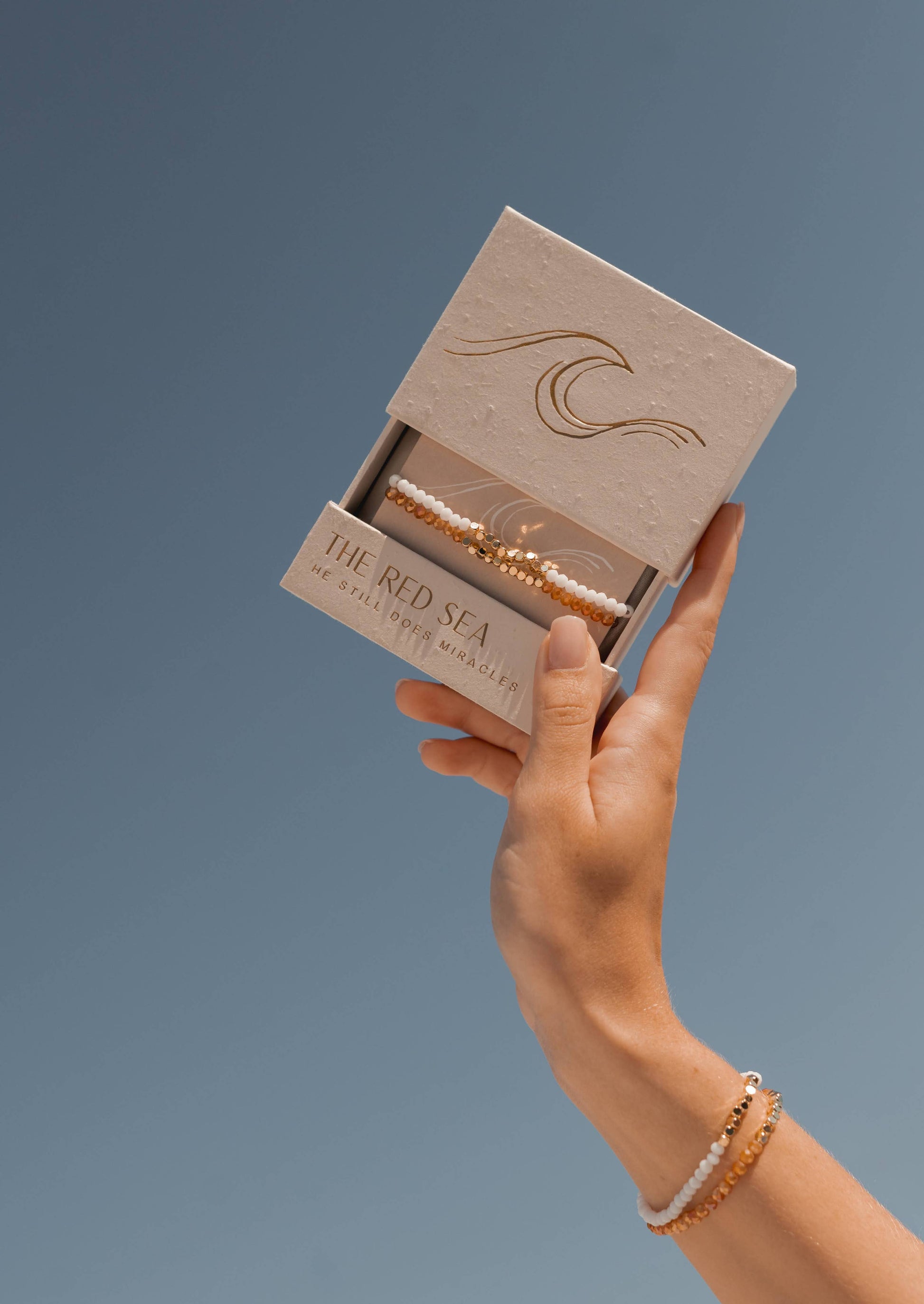 The clay bracelet represents the moment in the Bible when Moses parted the Red Sea, and the white bracelet represents the Lord who was with him every step of the way.